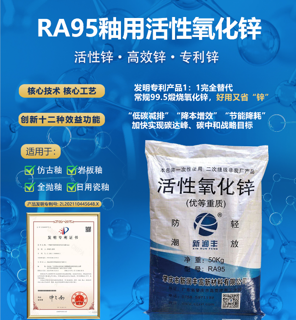 RA95活性氧化鋅它原是新潤豐湖南總部與美國(Kenedy Space Center)共同研發(fā)出來應(yīng)用于航空航天領(lǐng)域的一種納米級別的氧化鋅新材料。它是少數(shù)幾種可以實現(xiàn)量子尺寸效應(yīng)的氧化物型半導(dǎo)體材料,在此航空材料基礎(chǔ)上廣東新潤豐鋅業(yè)公司陶瓷事業(yè)部博士研發(fā)團隊再經(jīng)過一年多的時間,聯(lián)合有色金屬高校成立產(chǎn)學(xué)研科技創(chuàng)新材料項目,研制發(fā)明制備了可以應(yīng)用于陶瓷釉面的RA95釉用活性晶粒氧化鋅,并且在納米晶格上進行改性——晶格位移包覆銨基鋅后再進行高溫填充硅酸鹽納米活性劑,改變了亞納米晶粒的高溫分子運動性能,該釉用活性氧化鋅創(chuàng)新材料已經(jīng)獲得發(fā)明專利。